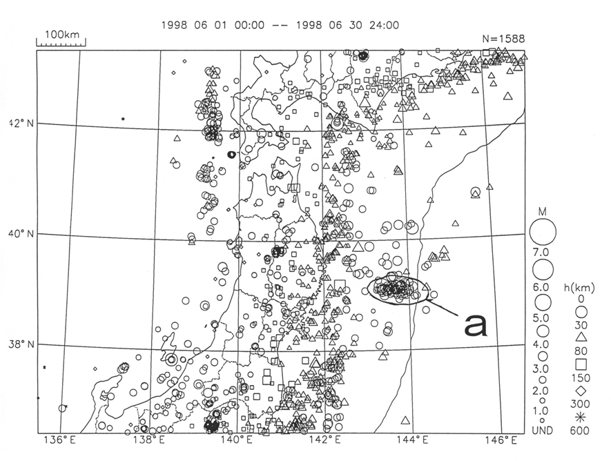 a)三陸沖で6/1にM5.2の地震が発生した。この地震は5/31に発生したM6.3の地震の余震である。