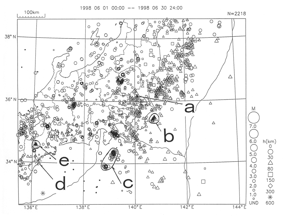 c)新島・神津島近海で6/25にM4.2の地震が発生した(最大震度3)。また、その南西海域の東海道沖で中旬にM3クラスを含むややまとまった地震活動があった。