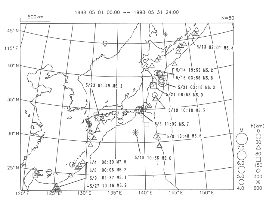 千島列島でM5.4、三陸沖でM5.2、M5.8、M6.3、宮城県沖でM5.0、関東東方沖でM5.2、伊豆半島東方沖でM5.7、鳥島東方沖でM5.6、周防灘の深さ85kmでM5.3、石垣島南方沖でM7.6とM5.2、M5.1、M5.2の地震が発生した。東海道沖の深さ約390kmでM5.0の地震が発生した。
