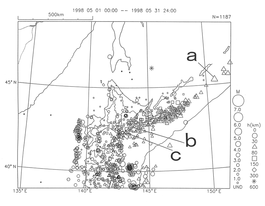c)十勝支庁南部で5/12にM4.2の地震が発生した。ほぼ同じ所で4/20にもM4.2の地震が発生した。