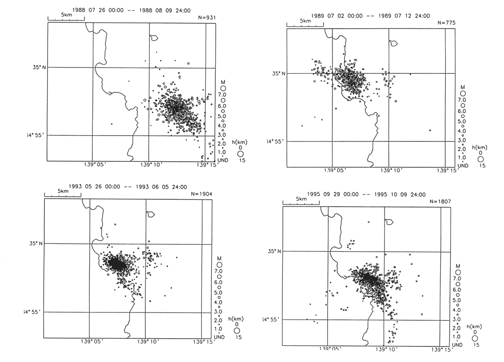 1988年〜1998年の震央分布の比較(1)(再決定震源)