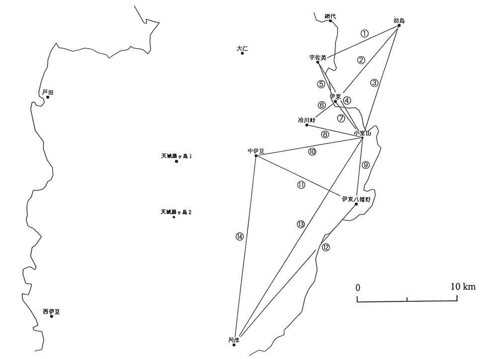 伊豆半島東方沖の群発地震活動に伴って、伊東市を中心にした地域の基線長に最大8cm程度の伸びが見られる (5/11現在)。