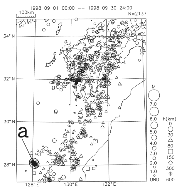 なお、期間外であるが東シナ海の深さ約220kmで10/3にM5.8の地震が発生した(最大震度3)。