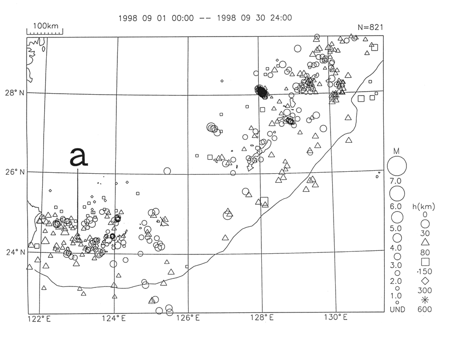 a)与那国島近海で9/13にM5.2の地震が発生した(最大震度3)。