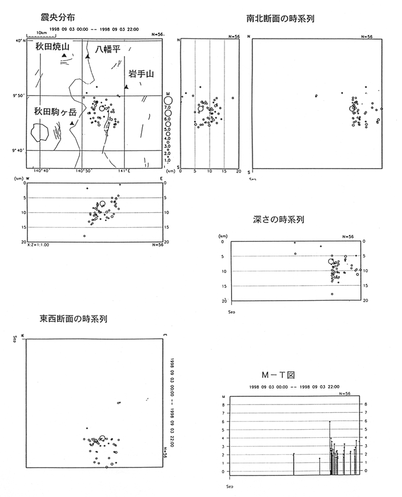 1998年9月3日00時〜9月3日22時ごろ(再決定震源)−−犬倉観測点、東北大松川温泉観測点の検測値を加えた震源決定結果