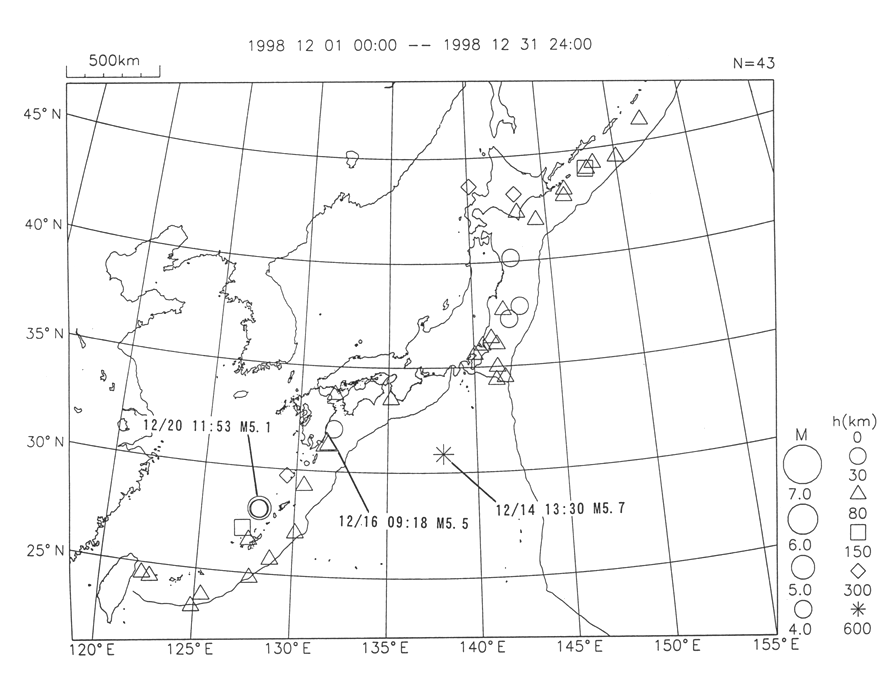 An M5.7 earthquake occurred off the eastern shore of Central Honshu at a depth of about 480km, an M5.5 earthquake occurred offshore of Miyazaki Pref., and an M5.1 earthquake occurred in the coastal waters of Amami Oshima.