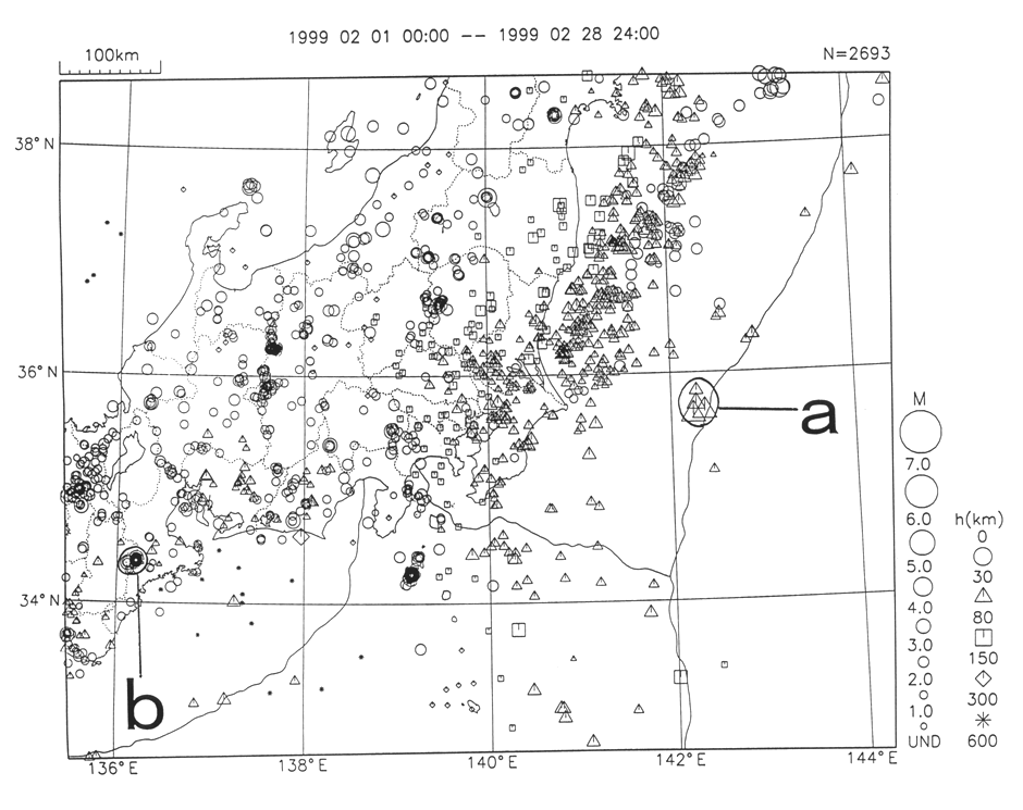 b) Numerous microearthquakes, the largest of M3 class, occurred in early Feb. in central Mie Pref.