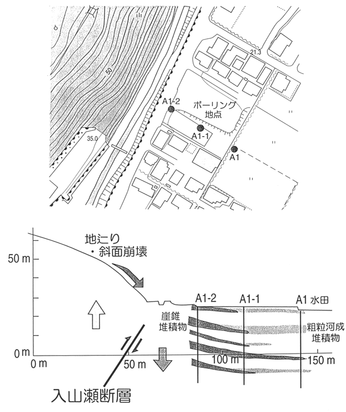 図−5:入山瀬断層滝戸(富士市滝戸;図−2参照)付近のボーリング地点(上図)とその付近の地形地質断面(下図)。下図に崖錐堆積物が描かれている。図−6も参照。(山崎ほか(1998)が学会発表で用いた図)