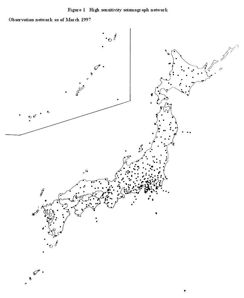 In Japan, the earthquake observation by high sensitivity seismographs is carried out at about 600 observation facilities, which belong to Urgent Earthquake and Tsunami Detection Network installed by Japan Meteorological Agency, microearthquake observation networks installed by universities, National Research Institute for Earth Science and Disaster Prevention in Science and Technology Agency, etc. in each region.