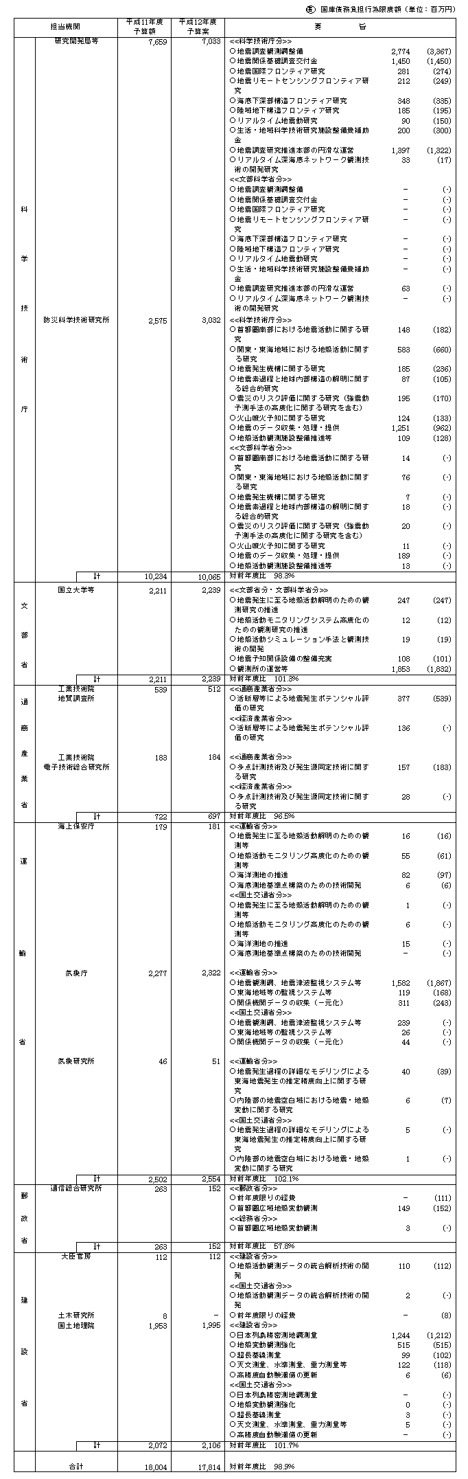 平成12年度地震調査研究関係政府予算案 注)四捨五入のため、各内数の合計は必ずしも一致しない。