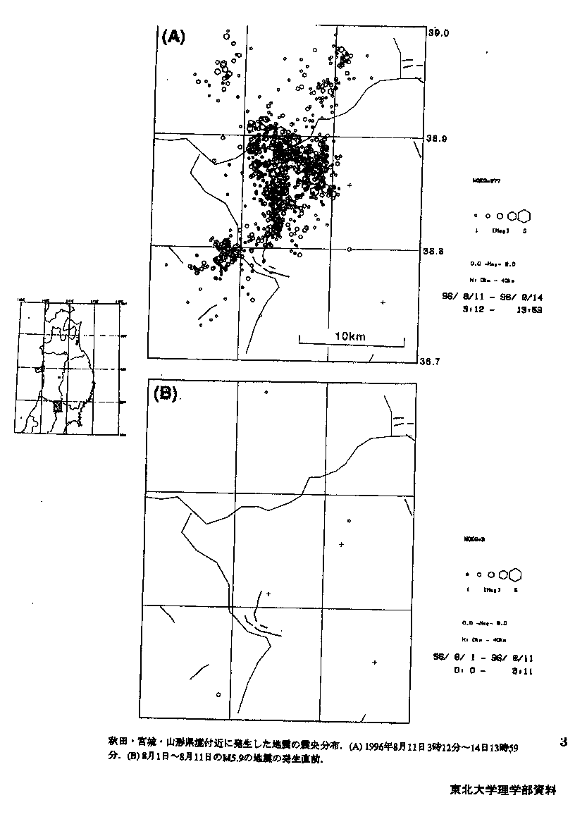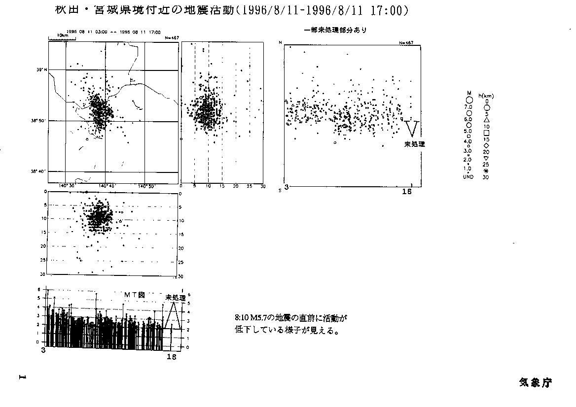 図1秋田・宮城県境付近の地震活動(1996/8/11-8/11 17:00)