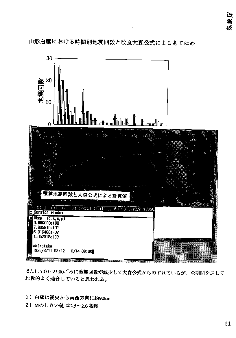 図9山形白鷹における時間別地震回数と改良大森公式によるあてはめ