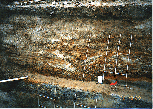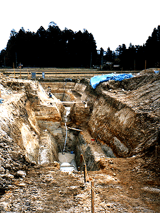 トレンチ調査――――― 活断層のトレンチ調査は、断層の通過している場所に調査溝(トレンチ)を掘り、その断面や平面の観察によって、過去に起こった断層運動を解読していく方法です。地層の中の土器などの遺跡や植物の化石から年代に関する情報を入手し、断層運動の発生時期や活動の間隔を把握していきます。