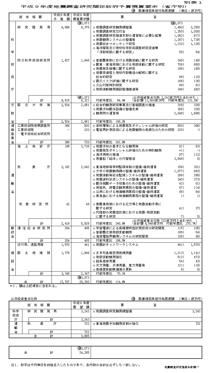 平成9年度地震調査研究関係政府予算概算要求(省庁別)