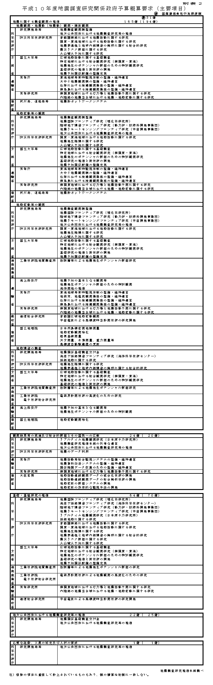 平成10年度地震調査研究関係政府予算概算要求(主要項目)