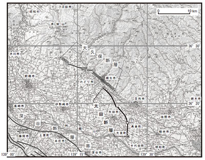 太田(おおた)断層は、群馬県桐生(きりゅう)市、太田(おおた)市、邑楽(おうら)郡邑楽町(おうらまち)、大泉町(おおいずみまち)、千代田町(ちよだまち)かけて分布する北北西−南南東走向の断層です。断層の西側が相対的に隆起する逆断層で、地表で確認できる長さは約18kmです。